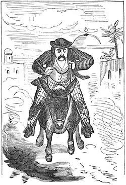 The narrow streets swarmed like a hive with men and women in strange Oriental costumes, and our small donkeys knocked them right and left as we plowed through them, urged on by the merciless donkey-boys. These persecutors run after the animals, shouting and goading them for hours together; they keep the donkey in a gallop always, yet never get tired themselves or fall behind. The donkeys fell down and spilt us over their heads occasionally, but there was nothing for it but to mount and hurry on again. We were banged against sharp corners, loaded porters, camels, and citizens generally; and we were so taken up with looking out for collisions and casualties that we had no chance to look about us at all. We rode half through the city and through the famous “street which is called Straight” without seeing any thing, hardly. Our bones were nearly knocked out of joint, we were wild with excitement, and our sides ached with the jolting we had suffered. I do not like riding in the Damascus street-cars.