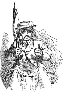 FULL-DRESSED TOURIST. our party of eight is the most so—they do cut such an outlandish figure. They travel single file; they all wear the endless white rag of Constantinople wrapped round and round their hats and dangling down their backs; they all wear thick green spectacles, with side-glasses to them; they all hold white umbrellas, lined with green, over their heads; without exception their stirrups are too short—they are the very worst gang of horsemen on earth; their animals to a horse trot fearfully hard—and when they get strung out one after the other; glaring straight ahead and breathless; bouncing high and out of turn, all along the line; knees well up and stiff, elbows flapping like a rooster’s that is going to crow, and the long file of umbrellas popping convulsively up and down—when one sees this outrageous picture exposed to the light of day, he is amazed that the gods don’t get out their thunderbolts and destroy them off the face of the earth! I do—I wonder at it. I wouldn’t let any such caravan go through a country of mine.