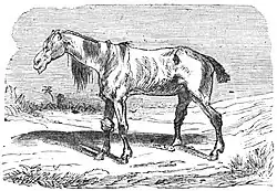 THE HORSE “BAALBEC.” tent-pole. Most of his teeth are gone, and he is as blind as a bat. His nose has been broken at some time or other, and is arched like a culvert now. His under lip down like a camel’s, and his ears are chopped off close to his head. I had some trouble at first to find a name for him, but I finally concluded to call him Baalbec, because he is such a magnificent ruin. I can not keep from talking about my horses, because I have a very long and tedious journey before me, and they naturally occupy my thoughts about as much as matters of apparently much greater importance.