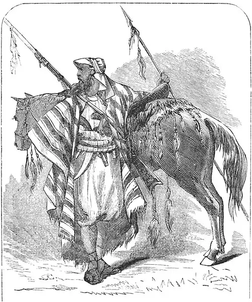 In the early morning we mounted and started. And then a weird apparition marched forth at the head of the procession—a pirate, I thought, if ever a pirate dwelt upon land. It was a tall Arab, as swarthy as an Indian; young—say thirty years of age. On his head he had closely bound a gorgeous yellow and red striped silk scarf, whose ends, lavishly fringed with tassels, hung down between his shoulders and dallied with the wind. From his neck to his knees, in ample folds, a robe swept down that was a very star-spangled banner of curved and sinuous bars of black and white. Out of his back, somewhere, apparently, the long stem of a chibouk projected, and reached far above his right shoulder. Athwart his back, diagonally, and extending high above his left shoulder, was an Arab gun of Saladin’s time, that was splendid with silver plating from stock clear up to the end of its measureless stretch of barrel. About his waist was bound many and many a yard of elaborately figured but sadly tarnished stuff that came from sumptuous Persia, and among the baggy folds in front the sun-beams glinted from a formidable battery of old brass-mounted horse-pistols and the gilded hilts of blood-thirsty knives. There were holsters for more pistols appended to the wonderful stack of long-haired goat-skins and Persian carpets, which the man had been taught to regard in the light of a saddle; and down among the pendulous rank of vast tassels that swung from that saddle, and clanging against the iron shovel of a stirrup that propped the warrior’s knees up toward his chin, was a crooked, silver-clad scimetar of such awful dimensions and such implacable expression that no man might hope to look upon it and not shudder. The fringed and bedizened prince whose privilege it is to ride the pony and lead the elephant into a country village is poor and naked compared to this chaos of paraphernalia, and the happy vanity of the one is the very poverty of satisfaction compared to the majestic serenity, the overwhelming complacency of the other.