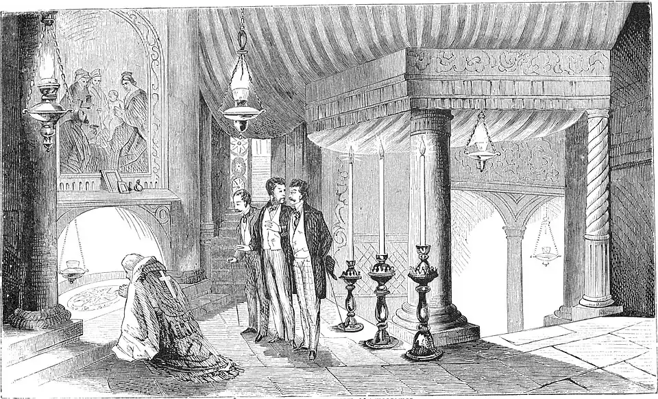We went to the Milk Grotto, of course—a cavern where Mary hid herself for a while before the flight into Egypt. Its walls were black before she entered, but in suckling the Child, a drop of her milk fell upon the floor and instantly changed the darkness of the walls to its own snowy hue. We took many little fragments of stone from here, because it is well known in all the East that a barren woman hath need only to touch her lips to one of these and her failing will depart from her. We took many specimens, to the end that we might confer happiness upon certain households that we wot of.