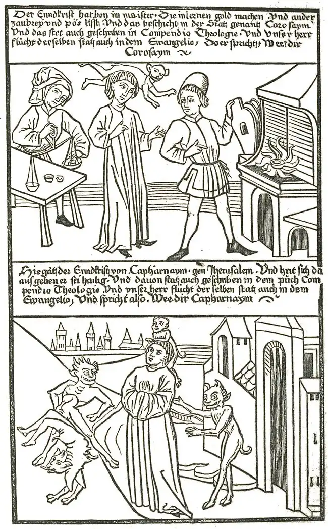 Antichrist is instructed by adepts, who teach him to make gold, the art of magic, and all sorts of evil. And this takes place at the city named Corosaym. And this stands also written in the Compendium Theologiæ. And our Lord curses the said city in his gospel, and says thus: "Woe to thee, Corosaym!"
