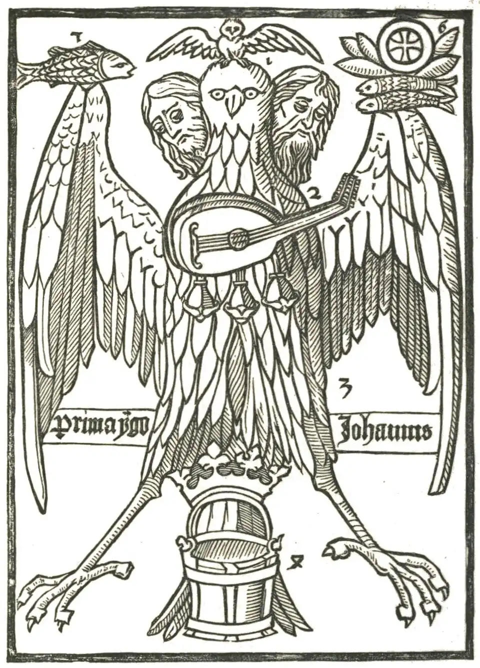 The designs are more eccentric than those of any known block-book, but the designer has shown no artistic ability in the grouping of his figures. The four Evangelists are symbolized — St. John by an eagle, St. Matthew by an angel, St. Luke by a bull, St. Mark by a lion — but they are presented to us in uncouth attitudes, and are surrounded or overlaid by some of the familiar objects frequently mentioned in the Gospels. These objects are numbered with Arabic figures referring to explanations in the text. The dove, for it must be so considered, although it looks like an owl, perched on the head of the symbolized St. John, may be accepted as the emblem of the Deity. The two heads beside the eagle are to be understood as those of Moses and of Christ. The musical instruments, a lute and three bells, on the breast of the eagle, indicate the contents
