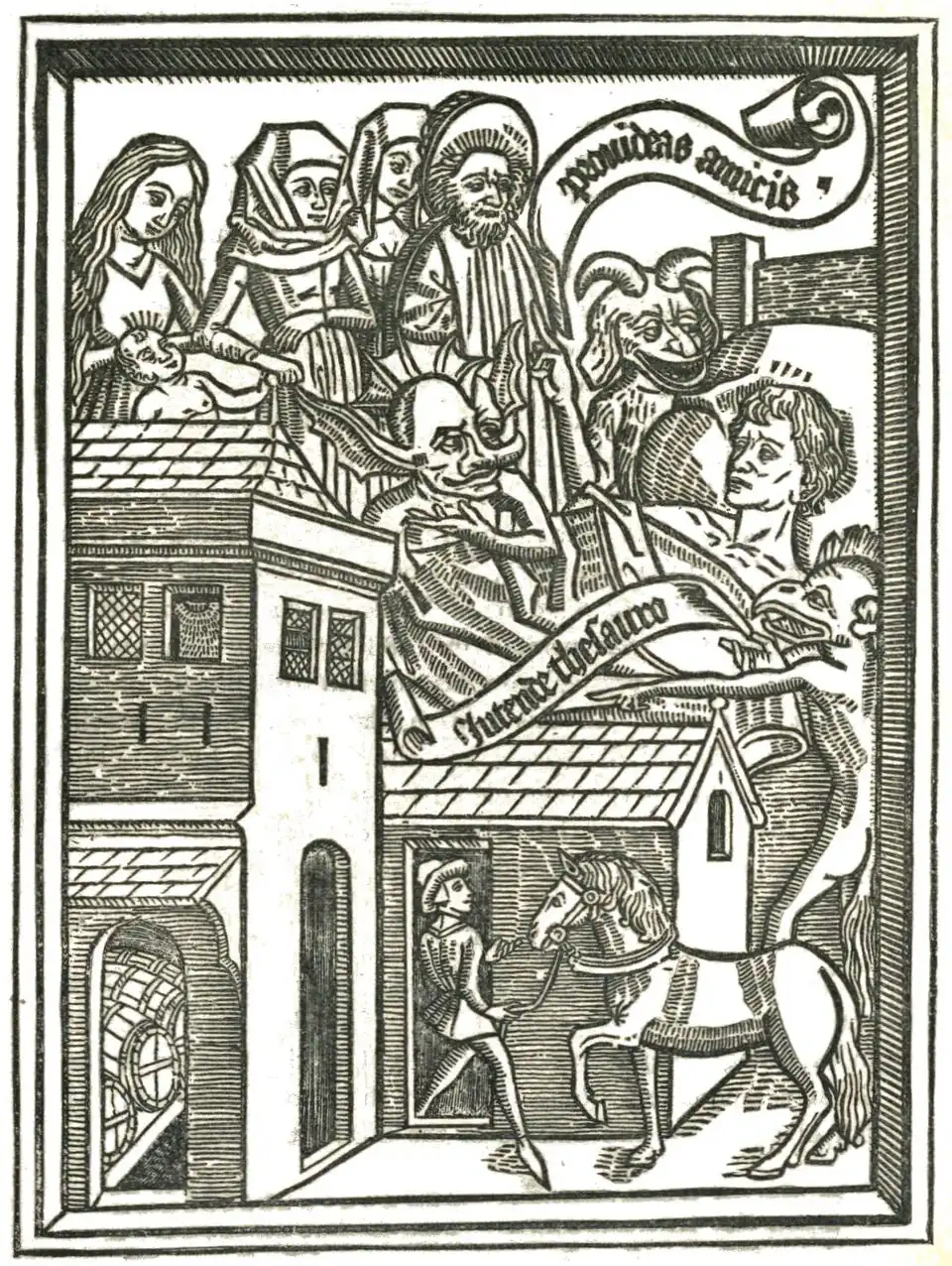 The object of the book is to present the temptations that beset the dying. The first illustration represents the dying man as tempted by devils concerning his faith. The next illustration shows the good angels who enable him to remain steadfast. In like manner he is tempted by devils to despair, to impatience (in which the moribund is vigorously kicking an attendant), to vainglory, and to avarice; but through help of the angels, he triumphs over all his adversaries. The ninth illustration, which is reproduced on the following page, shows the dying man as resisting the last assaults of three emissaries of the devil. The vigorous action of these hideous goblins is in marked contrast with the composure of the relatives, who stand at a respectful distance. The horse and hostler show that the man on the death-bed was rich. The moral of the design is the vanity of riches. One of the devils, the one at the head of the bed, maliciously suggests, Provideas amicis — you should provide for your friends. Another devil, pointing to the house, calls out with grim irony — Intende thesauro — pay attention to your treasures. This illustration is followed by another in which a ministering angel exhorts the dying man to discard the devil's advice, and not leave his property to his relatives, but to give it to the church. In the last illustration, the spirit of the dying man exhales from his mouth in the shape of a manikin, which is received by the angels. The