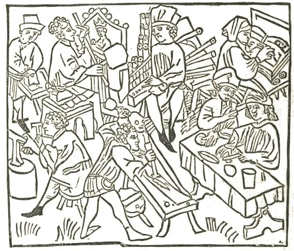 [From Dibdin.]The illustration shows only a portion of the upper part of this curious print, of which the British Museum has the only known copy. It is supposed to have been printed in the Netherlands.