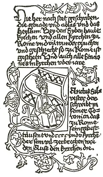 This small quarto of one hundred and eighty-four engraved pages is an example of patience in obscure letter-cutting that is more characteristic of China than of Europe. The text is in German, and is fairly printed in black ink on both sides of the paper. The book is enlivened by a few illustrations which have small merit as designs. The Wonders of Rome is an ecclesiastic's description of the more important shrines of the holy city, with their consecrated relics. The first page of the book contains an engraving of the handkerchief of Saint Veronica, which, according to the legend, was placed on the face of Christ to wipe away the blood that dripped from the crown of thorns, and received therefrom the impress of his features. Under this design the papal arms and the triple crown, the crossed keys, and the letters S. P. Q. R. The arms of the pope are those of Pope Sixtus iv, who occupied the papal chair from 1471 to 1484, within which period it is supposed that the book was engraved and published for German readers.