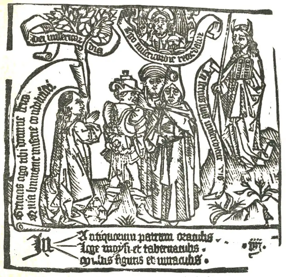 The xylographic editions of this work which contain the names of the printers are in the German language. One of them has these words, Hans Sporer, 1473; another has the imprint of J. W. Presbrm, of Nuremberg; another is dated Leipsic, 1496. One of the typographic editions, dated 1473, is attributed to John Gensberg, of Rome; another, dated 1478, bears the imprint of Ratdolt, of Venice. An edition with a typographic text was printed in 1488 by Peter Van Os, of Zwoll, the same printer who last owned the blocks of the Bible of the Poor. In this edition the words in the scrolls are in the Flemish language, and the text is in Latin. The use of Flemish in the engraved blocks seems to warrant the belief that there must have been an earlier edition, entirely xylographic, but no such edition has been discovered.