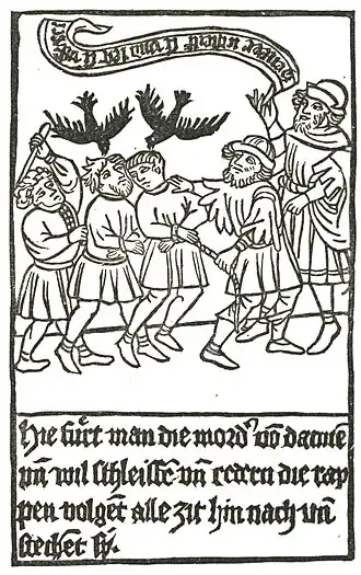 This book, which has an introduction of two pages in German, and forty-eight pages of illustrations, with brief descriptions below the pictures, tells the story of two bad men who murdered St. Meinrat, and who were immediately thereafter pursued by two crows. The illustration here presented represents the murderers on their way to execution, accompanied by the unrelenting crows. On the pages that follow are engravings of the murderers suffering under torture; it is shown how they were dragged at the heels of horses, and were broken and burnt on the wheel. The moral of this story is unmistakable: it is an awful crime to kill an ecclesiastic. The publication of so large a book to enforce so plain a truism is an intimation that some of the laity needed forcible illustrations of the danger of abusing the clergy.