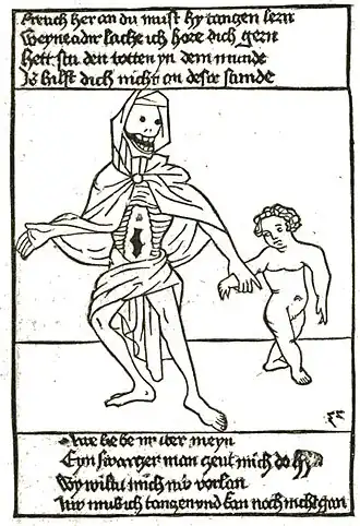 [From Dibdin.]is entirely xylographic, with a text in German; the other copy, in a Munich library, has also a text in German, but it is in manuscript. For each edition a different suite of blocks was used. Nothing is known about the printer of either book, nor about the date of its execution. The designs are really meritorious, and the engraving is obviously the work of a man who had experience in his art, but the merit of the work has been overshadowed by the superior designs of Holbein and the more masterly engravings of Lutzelberger. The characters or personages in this block-book are the same as those in the famous painting once at Basle.