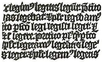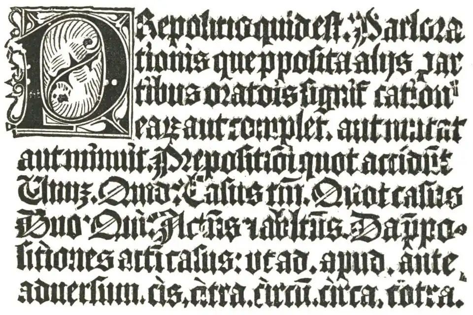 - ↑ The full title of the book is Donatus de octibus partibus orationis, or Donatus on the Eight Parts of Speech. It is sometimes designated as Donatus pro puerilis, or the Donatus for Little Boys.