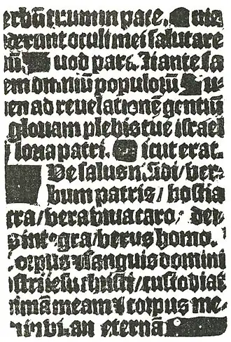 To support his theory that this fragment of the Donatus is but a part of one of the many copies of the book which were printed in Holland before the invention of typography, Koning submits the fac-simile of a page from an old Horarium, or manual of devotion, which was copied by him from the original block. He says that this block once belonged to Adrien Rooman, a Haarlem printer of the seventeenth century, who had received it from one of the descendants of Coster. That Coster engraved or printed this block is highly improbable, but it is, without doubt, a very old piece of engraving. It can be fairly attributed to the fifteenth century, but no good evidence has been adduced to show that it was made before the invention of types. The block is practically worn out: the letters have been so flattened by impression that many of them are illegible.