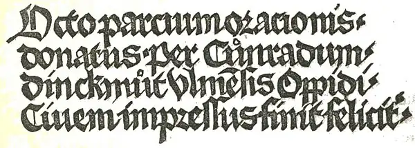 The irregular manner in which all the early xylographers drew and engraved letters on the block is fairly shown in this fac-simile of the imprint of Conrad Dinckmut, of Ulm, who affixed it to a Donatus printed by him in 1480. It will be seen that parallel lines ruled between the printed lines would interfere with almost every ascending or descending letter.