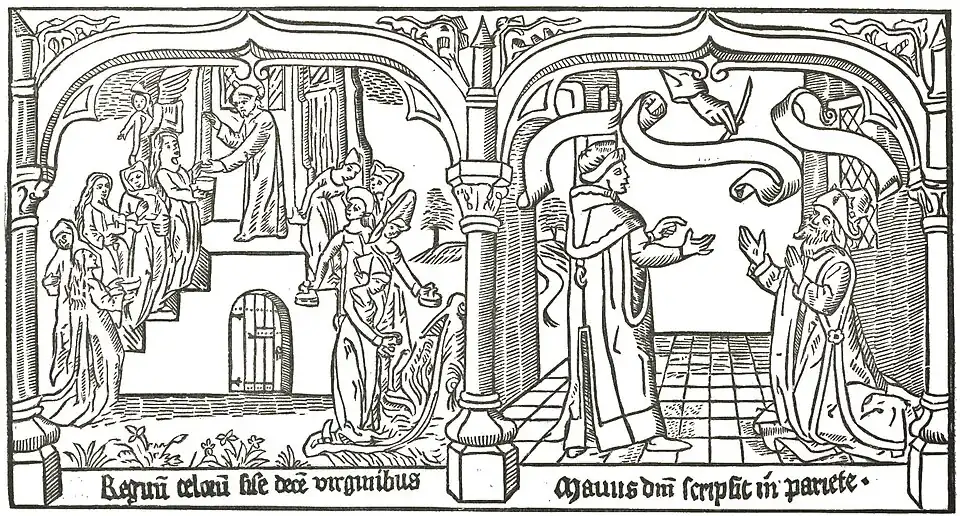 An illustration on the last page of the book represents the Parable of the Ten Virgins, to which is added the legend, The Kingdom of Heaven is likened unto Ten Virgins. The five foolish virgins are sadly descending into the mouth of the monster that represents Hell. Another illustration represents the prophet Daniel interpreting the writing on the wall.