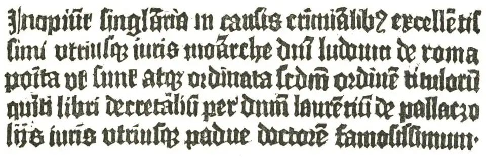 Type IV. Of this face, the fragments of four copies, and presumably of four distinct editions, of the Donatus have been found. This type, which does not closely resemble the faces previously described, was founded on a body a little larger than Paragon. The largest book in this type is a treatise on the Roman Law, apparently an abridgment of the fifth book of the Pandects of Justinian. It is described in the preface as The Peculiarities of Criminal Law, by Lewis of Rome. This treatise, which consists of forty-four pages, is printed in the form of small folio, twenty-six lines to the page. It was the largest book and contains the largest type of the unknown printer.