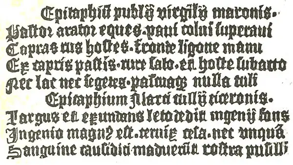 Type V. The forty-fifth page and all subsequent pages of the book previously described are devoted to a Treatise and Epitaphs by Pope Pius ii, and a Eulogy on Lorenzo Valla. In these names we find sure indications of the probable age of the book: Cardinal Piccolomini