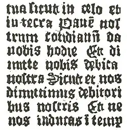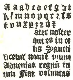 The other fragment in this type is a little pamphlet of eight pages, printed on parchment and upon one side only. It is described by some as a Horarium, or a little book of prayers; by others as an Abecedarium, or a child's primer. It contains the Alphabet (all the small letters but not the capitals), the Lord's Prayer, the Ave Maria, the Apostles' Creed, and two prayers. The Alphabet has the k, a letter that was not used in the Latin language; it has no w, this letter being formed by the union of the two characters v. Holtrop says that the types seem to have been made for the Dutch language.