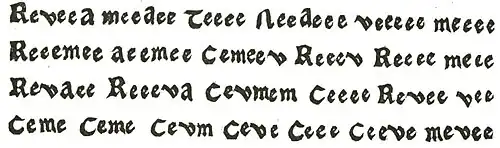 - ↑ Hessels does not describe this as Type VIII, but as the Type of the Enschedé Abecedarium. He thought it "advisable to separate these two little works [the Donatus and the Abecedarium, which are printed in this face], to a certain extent, from the others" but he admits that the types of these books bear the family likeness and cannot be omitted.
