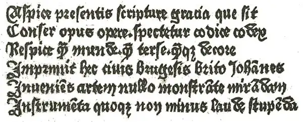 - ↑ Behold what favor is due to the writing! Compare work with work and examine copy with copy [i. e. notice the uniformity of the letters]. Consider how clearly, how neatly, how handsomely, John Brito, a citizen of Bruges, prints these works, having discovered a very wonderful art, nobody having instructed him, and the very astonishing implements also, not less praiseworthy.