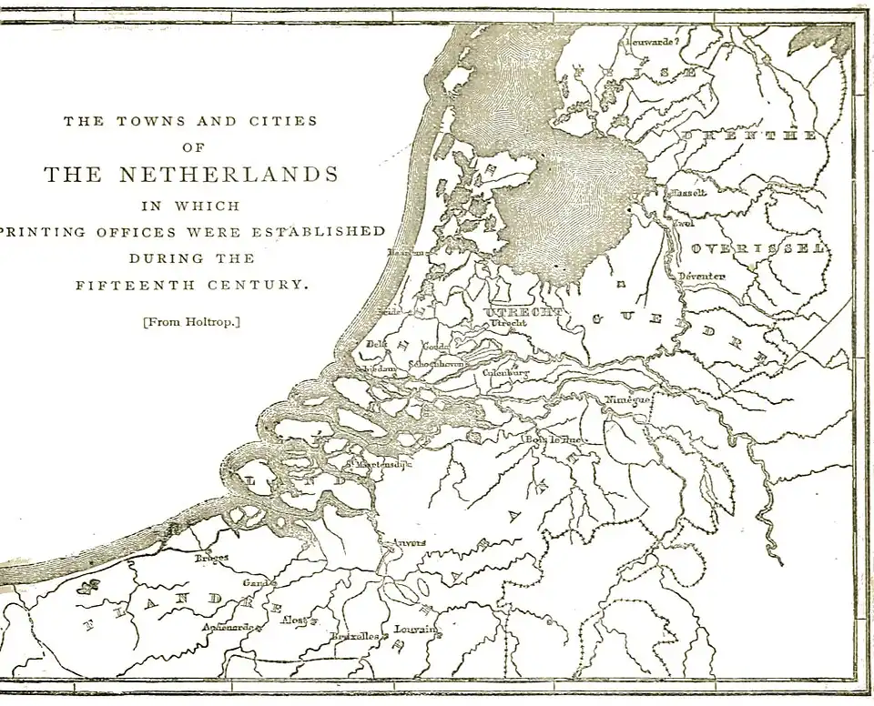 The Paper-Marks of the Speculum, with Fac-simiies … Not Evidence of Age … The Earliest Dated Annotation … Earliest Known Manuscript copy in Dutch … Indications that the Book was Printed at Utrecht … Probably Printed in the Last Half of the Fifteenth Century … Review of the Evidences … The Cambray Record … Printers of the Fraternity of St John at Bruges … Testimony of Zell in the Cologne Chronicle … All Unsatisfactory … Discordant Opinions … Dutch Printing probably Xylographic … No Evidence of an Early Use of Types in Holland … Early Printing in Haarlem … Jacob Bellaert …Fac-simile of his Types … His Successors … Brito of Bruges, with Fac-simile of his Types … Was not an Inventor … Netherlandish Knowledge of Printing came from Cologne … Map of the Netherlands … Not probable that Types were Used there before 1463.