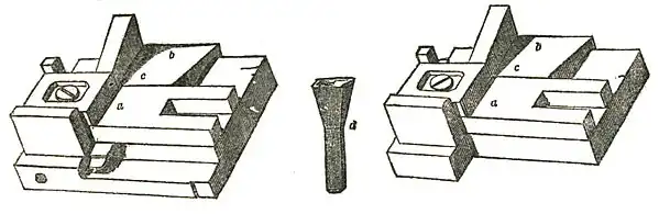 M. de Berny showed me one of these primitive mechanisms in his own foundry. This mould, which is still [1853] in use, is constructed with two kinds of knees [or squares] enabling the type-maker to adjust it in various ways so as to cast any body desired. De l'origine, etc. vol. i, p. 44, note.