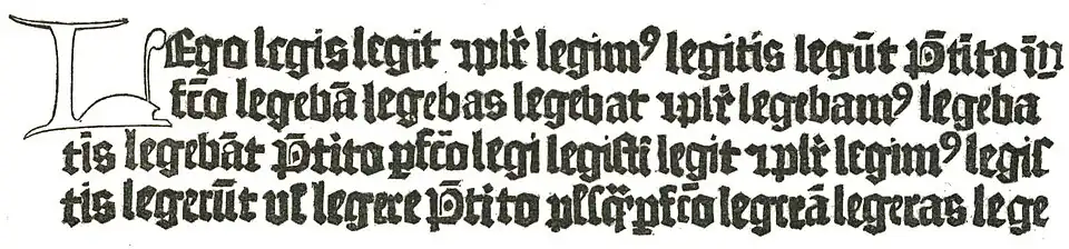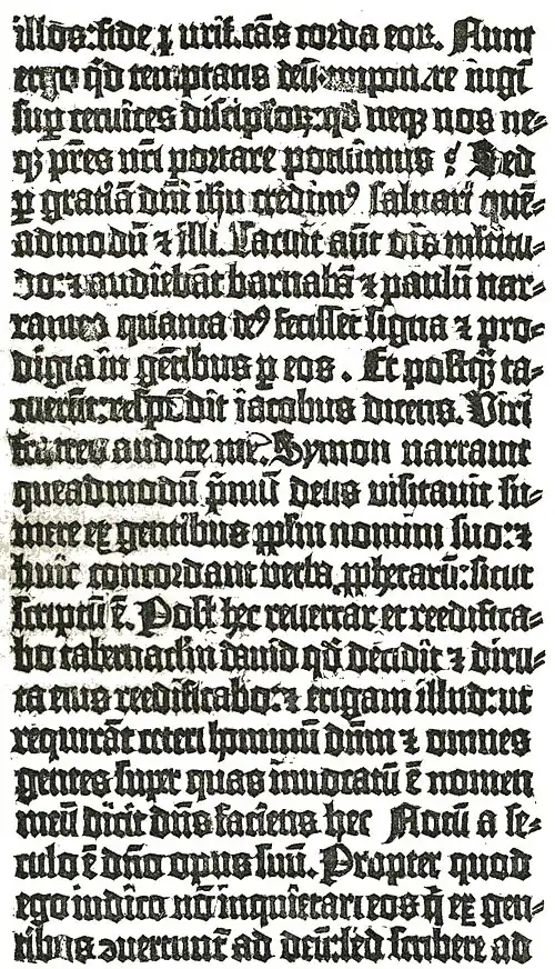 - ↑ In the year of our Lord 1450, they began to print, and the first book they printed was the Bible in Latin: it was printed in a large letter, resembling the letter with which, at present, missals are printed. Cologne Chronicle of 1499.