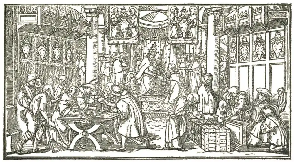 Fac-simile of Holbein's Satire on the Sale of Indulgences.