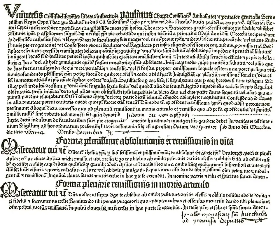 Whereas the Most Holy Father in Christ, our Lord, Nicholas V, by divine grace, pope, mercifully compassionating the afflictions of the kingdom of Cyprus from those most treacherous enemies of the Cross of Christ, the Turks and Saracens, in an earnest exhortation, by the sprinkling of the blood of our Lord Jesus Christ, freely granted to all those faithful followers of Christ, wheresoever established, who, within three years from the first day of May, in the year of our Lord 1453, should piously contribute, according to their ability, more or less, as it should seem good to their own consciences, to the procurators, or their deputies, for the defense of the Catholic religion and the aforementioned kingdom, — that confessors, secular and regular, chosen by themselves, having heard their confessions for excesses, crimes, and faults, however great, even for those hitherto reserved exclusively for the apostolic see to remit, should be licensed to pronounce due absolution upon them, and enjoin salutary penance; and, also, that they might absolve those persons, if they should humbly beseech it, who, perchance might be suffering excommunication, suspension, and other sentences, censures, and ecclesiastical punishments, instituted by canon law, or promuIgated by man, — salutary penance being required, or other satisfaction which might be enjoined by canon law, varying according to the nature of the offence; and, also, that they might be empowered apostolic authority to grant to those who were truly penitent, and confessed their guilt, or if perchance, on account of the loss of speech, they could not confess, those who gave outward demonstrations of contrition—the fullest indulgence of all their sins, and a full remission, as well during life as in the hour of death—reparation being made by them if they should survive, or by their heirs if they should then die: And the penance required after the granting of the indulgence is this—that they should fast throughout a whole year on every Friday, or some other day of the week, the lawful hindrances to performance being prescribed by the regular usage of the Church, a vow or any other thing not standing in the way of it; and as for those prevented from so doing in the stated year, of any part of it, they should fast in the following year, or in any year they can; and if they should not be able conveniently to fulfill the required fast in any of the years, or any part of them, the confessor, for that purpose shall be at liberty to commute it for other acts of charity, which they should be equally bound to do: And all this, so that they presume not, which God forbid, to sin from the assurance of remission of this kind, for otherwise, that which is called concession, whereby they are admitted to full remission in the hour of death, and remission, which, as it is promised, leads them to sin with assurance, would be of no weight and validity: And whereas the devout Judocus Ott von Apspach, in order to obtain the promised indulgence, according to his ability hath piously contributed to the above-named laudable purpose, he is entitled to enjoy the benefit of indulgence, of this nature. In witness of the truth of the above concession, the seal ordained for this purpose is affixed. Given at Mentz in the year of our Lord 1454, on the last day of December.