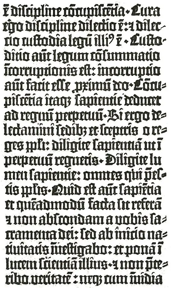 Fac-simile of the Types of the Bible of 36 Lines, with the Rubricator's Marks on the Capitals. Verses 17 to 22 of the Sixth Chapter of the Book of Wisdom.