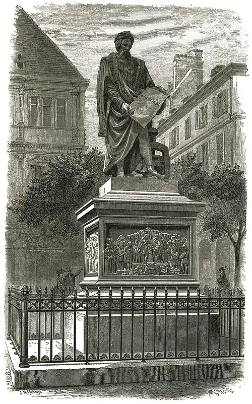 - ↑ Representing that the use of wood-cuts by typographers was an infringement on the vested rights of the guild, the block-printers induced the magistrates to pass a law commanding printers not to use wood-cuts. Not deriving the benefits they expected from this restriction, the block-printers proposed to concede to the typographers the right to use as many cuts as they pleased, providing they would agree to use only the wood-cuts made by regular engravers.