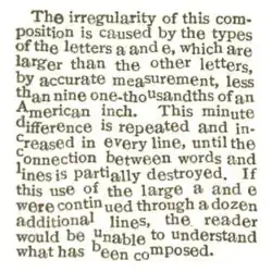 Illustration of Types of Irregular Body.There is something more in types than is apparent at the first glance. Simple as they may seem, they are evidences of notable mechanical skill in the matter of accuracy. The page before the reader was composed with more than 2,000 pieces of metal; the large page of a daily paper may contain more than 150,000 of these little pieces. Whether the page is large or small, the types are always closely fitted to each other; they stand accurately in line, and the page is truly square. If the types of one character, as of the letter a, should be made the merest trifle larger or smaller than its fellows in the same font, all the types, when composed, will show the consequences of the defect. The irregularity of line that is scarcely perceptible in the first row will be offensively distinct in the second. It will increase with each succeeding row, until the types become a heap of confusion which cannot be handled by the printer. Advantages which might be secured from movable types are made of no effect by an irregularity so slight that it would be passed unnoticed in the workmanship of ordinary trades. The illustration proves that it is not enough for types to be movable; they must be accurate as to body; they must fit each other with geometrical precision.