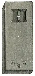 - ↑ The characters D, E, I are the private reference marks of the type-founder. In this position they cannot be reproduced on the cast type.