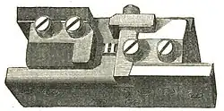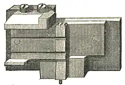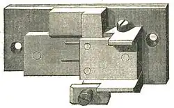 Figure 1. Type-Mould, without Matrix and with a Type in the Mould.would lead to fatal faults in inaccuracy of body. Exactness of body can be had only by casting all the characters in one mould, but this mould must be made to suit all the matrices. The matrices must be frequently changed, but with such nicety that the types of every letter shall be uniform in height, in line, and truly square. Any mechanic will see that the construction of an adjustable mould is work of difficulty, and that the fitting-up of a set of matrices for one mould is a very nice operation.