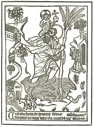 According to the legend, it was the occupation of Saint Christopher to carry people across the stream on the banks of which he lived. He is accordingly represented as a man of the weight of gigantic stature and strength. One evening a child presented himself to be carried over the stream. At first his weight was what might be expected from his infant years; but presently it began to increase, and kept increasing, until the ferryman staggered under his burden. Then the child said, "Wonder not, my friend; I am Jesus, and you have the sins of the whole world on your back." St. Christopher was thus regarded as a symbol of the church.