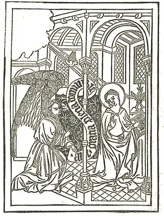 In the book which contained this print of the St. Christopher was also found, pasted down within the cover, another engraving on wood, that is now known as the Annunciation. It is of about the same size as the print of St. Christopher. It is printed on the same kind of paper, with the same dull black ink. There is some warrant for the general belief that both engravings were executed at or about the same time, but they are so unlike that they cannot be considered as the work of the same designer nor of the same engraver. The lines of the Annunciation are more sharply cut; the drawing has more of detail; there are no glaring faults of perspective.
