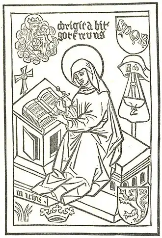 St. Bridget.Saint Bridget of Sweden, born 1302, died 1373, was one of the chosen saints of Germany. The print represents her as writing in a book while the Virgin and the infant Christ look down approvingly. The letters S. P. Q. R. on the shield, and the pilgrim's hat, staff and scrip are supposed to indicate her pilgrimages to Rome and Jerusalem. The armorial shield has the arms of Sweden. The legend, if it can be so called, at the top of the print is in German: O Brigita bit got für uns.—O, Bridget, pray to God for us. The letters M. I. Chrs at the bottom of the print have been construed as, Mother of Jesus Christ.