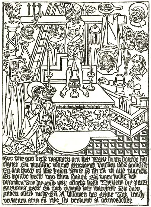 - ↑ A book printed at Delft in 1480, says that when St. Gregory was pope, he celebrated mass in the church Porta Crucis. As he was consecrating the bread and wine, Christ appeared to him as represented in the engraving, with all the accessories to his passion. Robert of Cologne, who wrote a treatise on indulgences, published at Zutphen in 1518, adds, that Pope Gregory kindly granted 14,000 years of indulgence; that Pope Nicholas V doubled them; that Pope Calixtus, after requiring the repetition five times of the prayers, again doubled the years of indulgence; that Pope Innocent VIII, after adding seven more prayers, two other prayers, and two more of the Pater Noster and the Ave Maria, again doubled the length of indulgence—so that the sum total amounted to at least 70,000 years: according to other computations, to 92,000 years, or 112,000 years. Holtrop, Monuments typographiques, p. 13. There is but one copy of this print, which recently belonged to the collection of Theodor O. Weigel of Leipsic, who published a fac-simile of it in colors, in his great work, The Infancy of Printing, plate 113, vol. 1.
