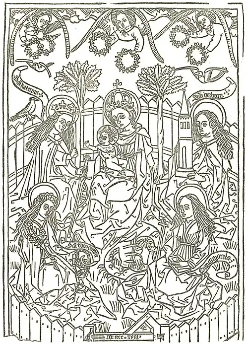 A much more satisfactory evidence of the great age of Flemish engraving on wood is afforded by the Brussels Print, which was discovered in 1848 by an innkeeper, pasted down on the inside of an old chest. It was bought by an architect of the town of Mechlin, who sold it for five hundred francs to the Royal Library of Brussels, where it is now preserved. This print bears the date 1418, but the validity of the date has been challenged. It was alleged that the numerals that form the date had been repaired with a lead pencil in such a manner as to provoke doubts of its genuineness; that the true date is 1468, instead of 1418; that an alteration was made, by scratching out the L from the middle of the numerals [thus, mcccc(l)xviii] and by substituting a period—a fraud that puts the date backward fifty years. The charge of fraud has been denied with ability, and seemingly with justice. The print has passed the ordeal of hostile criticism, and is now accepted as a genuine print of 1418. It represents the Virgin and infant Saviour, when surrounded by St. Barbara, St. Catharine, St. Veronica and St. Margaret. The design is somewhat stiff and mechanical, but the composition is not devoid of merit. The lines of the engraving were purposely broken, for it was intended that the print should be more fully developed by the bright colors of the stencil painter. The fac-simile is taken from Holtrop's Monuments typographiques. Holtrop says that the fac-simile is slightly reduced in height. The size of the block, as he represents it, is 9⅞ by 13¾ American inches.
