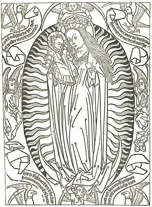 The Flemish origin of the Brussels Print is established by an image, in the Cabinet of Engravings at Berlin, now known as the Berlin Print. It is of the same size as the Brussels Print, and is, apparently, the work of the same designer, for in these prints a remarkable similarity of treatment in designing and engraving may be noticed in the wings of the angels, in the figure and position of the angel who crowns the Virgin, in the crowns of St. Catharine and the Virgin, in the flowing hair of the three saints, and that of the Virgin, and in the collars on the doves. This print represents the Virgin as carrying in her arms the infant Saviour. It is described in the catalogue as an early xylographic engraving, printed by friction about the middle of the fifteenth century. It is without date or name of artist. The language of the legend is Flemish. The Virgin holds in her right arm the infant Jesus, and in her left hand an apple. The child caresses the chin of his mother with one hand, while he drops a rose from the other. The Virgin, enshrined in an aureole of glory, encircled by four angels and four doves, placidly stands upon a crescent. The legend in the four corners is in metre, and is an exhortation to the reader to serve the Virgin, and imitate her example.