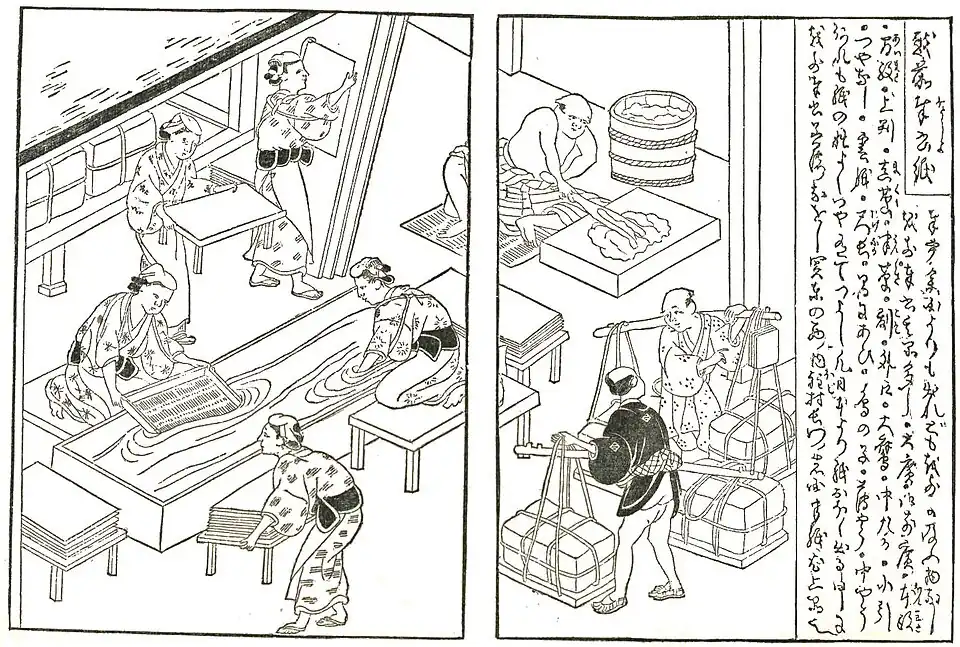 - ↑ The artist was not restricted by the scant space that allowed him to show only the leg of the pulp-beater on the first page. He does this, and then, with an amusing unconsciousness of its impropriety, proceeds to draw the head and body on the following page, which, in the Japanese book from which this was taken, is the other side of the leaf.