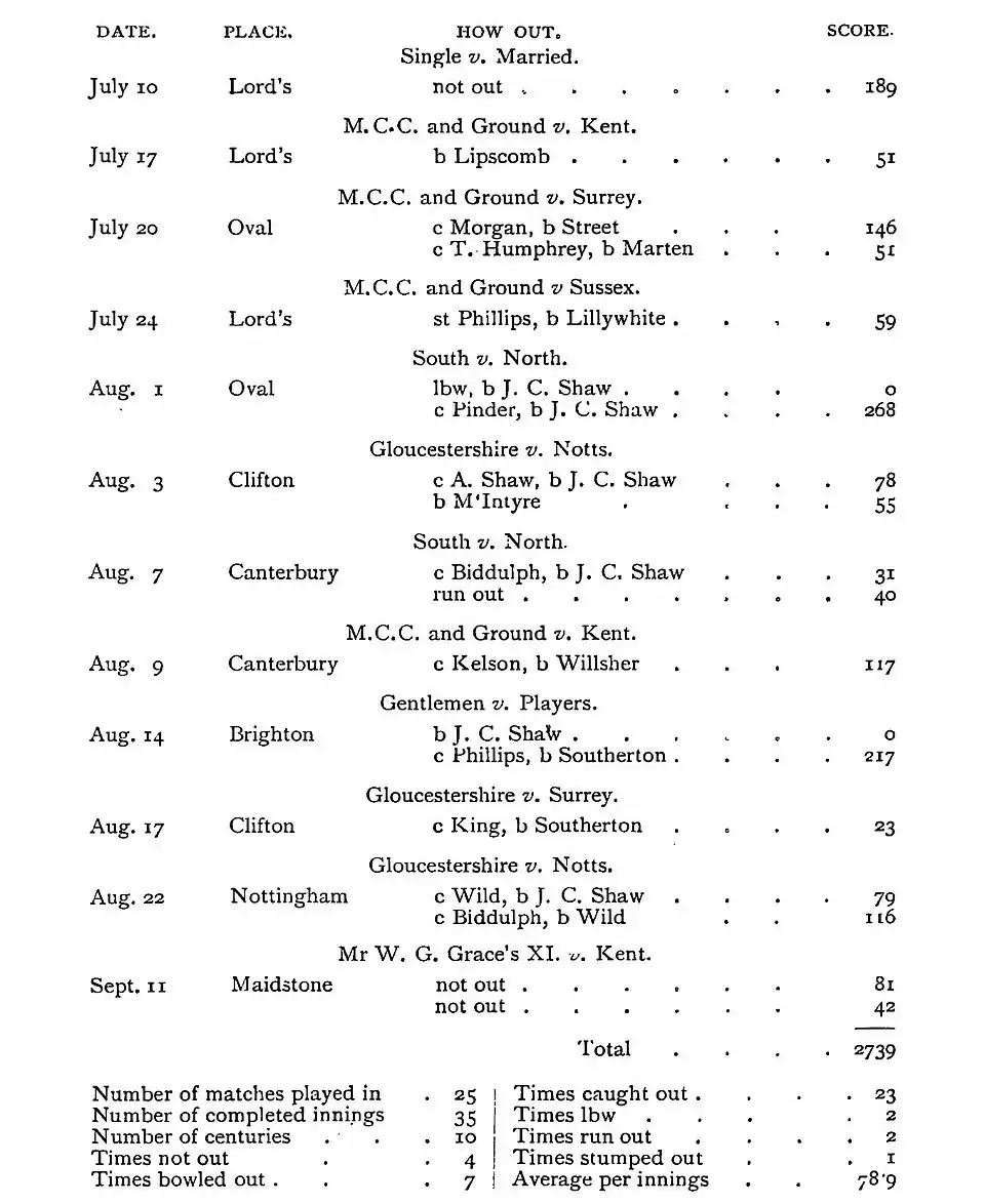 In 1895 I became qualified, and played my first match for Sussex v. M.C.C. at Lord's; and a most remarkable first match it was for me, contributing, as I did, 77 not out and 150. That year I scored as follows for Sussex:—