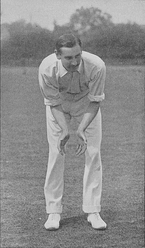 The attitude best suited to slip is a slight stoop forwards. It is good for reaching catches low down, and also for quickness of movement in all directions. The hands should be held forward ready for a catch. Slip should stand in such a manner that he can throw himself at once into any position The legs should not be too far apart, and one foot should be rather in front of the other.