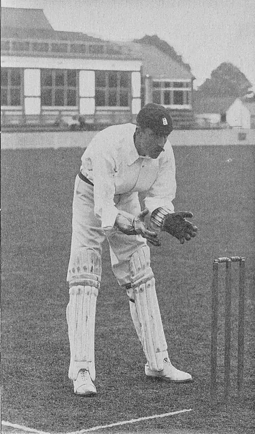 Perhaps long-stop should stand slightly to the leg-side in order to see the ball as it is bowled, and to stop, if possible, any very fine snicks. He should be as far away from the wicket as he can without failing to check the single run when the wicket-keeper misses the ball. The distance depends rather on the pace of the bowler. The slower the bowler, the nearer should long-stop be