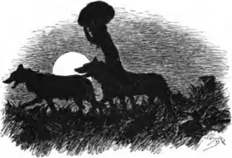 When the moon rose over the plain, making it look all milky, the horrified villagers saw Mowgli, with two wolves at his heels and a bundle on his head, trotting across at the steady wolf's trot that eats up the long miles like fire. Then they