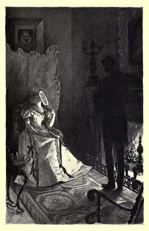 We were sitting by the fire one evening in the twilight; she was playing with a hand-screen, but suffering the flames to paint her face and throw into relief the sensitive merry lips and the eyes so full of varied meanings. She had told me to go, and I had not gone; she leaned back and, after one glance of reproof, fixed her regard on the polished tip of her shoe that rested on the fender. She meant that she would talk no more to me; that in her estimation, since I had no business to say, I was already gone. An impulse seized me. I do not know what I hoped nor why that moment broke the silence which I had imposed on myself. But I told her about the little, fair, chubby child at the Castle of Bartenstein. I watched her closely, but her eyes never strayed from her shoe-tip. Well, she had never said a word that showed any concern in such a matter; even I had done little more than look and hint and come.