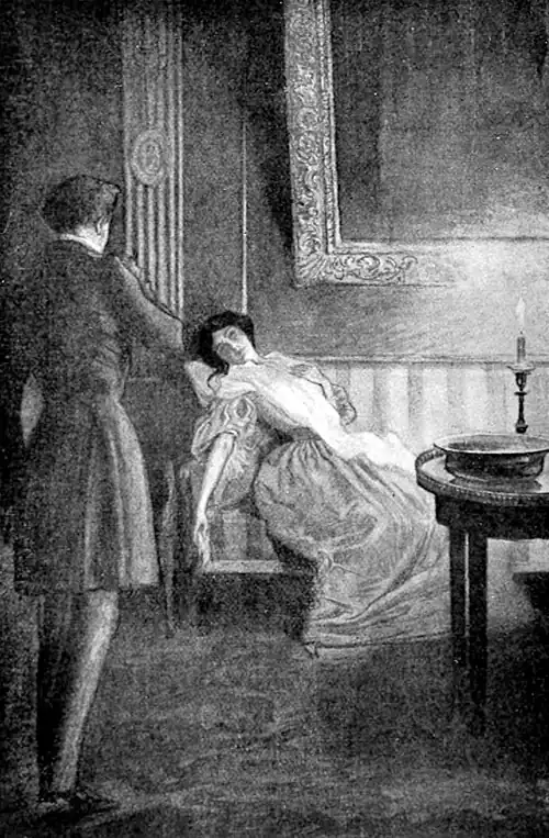 The room to which she had fled was it only by a single candle. She lay back on a great sofa, her dress undone, holding one hand on her heart, and letting the other hang by her side. On the table was a basin half full of water, and the water was stained with streaks of blood.