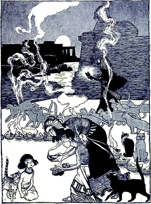 “Yes, thou hast heard aright. I can tell thee a strange tale of the cats of Egypt. When a fire occurred, the people allowed it to rage itself out, while they stood round and tried to prevent the cats from being burnt. But the animals slipped past them into the flames and invariably perished. Whereupon the whole household went into mourning, and shaved their eyebrows.”