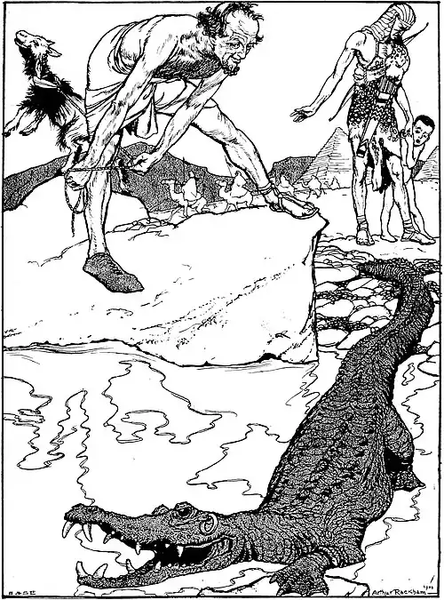 “I will tell thee one mode of capture. A piece of pork was placed upon a hook and flung into the centre of the stream, while a man upon the bank beat a pig. The cries of the pig attracted the crocodile, who swam towards the shore, came upon the pork, swallowed it, and was then dragged to land and killed.”