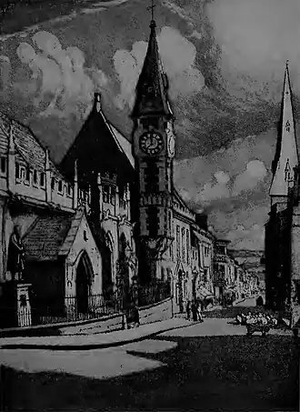 East High Street, Dorchester, showing St. Peter’s Church, the bronze statue of William Barnes, the Corn Exchange and the King's Arms Hotel. From an aquatint by John Everett.