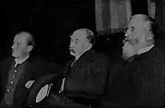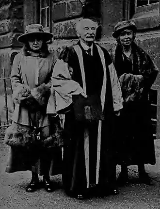 Hardy receiving the degree of D. Litt. at Oxford. To his right is Mrs. Hardy; to his left, Lady Raleigh, wife of Sir Walter Raleigh, late Professor of English Literature at the University.