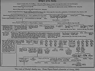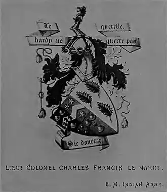 Coat-of-arms of the Hardy family. From Payen-Payne's Armorial of Jersey, 1862. Sable on a chevron between three escallops, or as many griffins' heads of the field. Quartering: Azure, a chevron, or, between three cinquefoils, argent, for De Beauvoir: Gules, three escallops, or a crescent for difference, for Dumaresq: and Gules, three escallops, or a fleur-de-lis, for difference, for Dumaresq. Impaling: Argent, three leaves, vert, for Irving. Crest: A dexter arm, embowed, in armour, gauntlet, ppr., garnished, or holding a griffin's head, as in the arms.